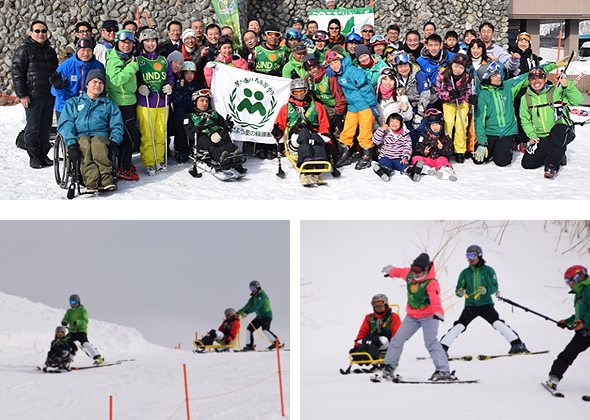 ダスキン・アジア太平洋障害者リーダー育成事業 第17期研修生6人はNASPAスキーガーデン(新潟県湯沢町)で1月23日、24日の2日間スキー研修を行いました。 また、「愛の輪会員と研修生とのふれあい活動」も同時に開催され、本部働きさんを含む17人が参加しました。 研修生は新潟県で障がい者スキー指導を専門に活動しているNPO法人「ネージュ」の指導のもと、2日間で全員が滑れるようになり、愛の輪会員と一緒にスキーを楽しみました。「障がい者スキー体験」ではアイマスクを着用してスキーを滑り、障がい者がスキーをすることの難しさを体験しました。 懇親会にはダスキンフランチャイズチェーン全国加盟店東京ブロック会から16人が研修生とのふれあいを目的に参加。参加者は「このような形で研修生と交流したのは初めて。とても楽しかった。スキーにチャレンジする研修生の姿に感動した」と話しました。