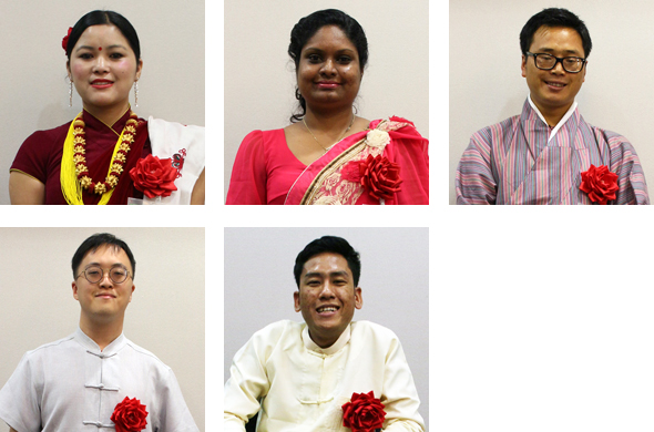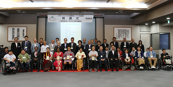 ダスキン・アジア太平洋障害者リーダー育成事業 第20期研修生の開講式が9月25日にダスキンスクールで開催されました。来賓として在大阪スリランカ民主社会主義共和国名誉総領事 D.W.アルッガマゲ様、台北駐大阪経済文化弁事処部長 黄水益様など約70人が参加されました。 山村理事長から「今回の研修生は20期生の節目となります。皆さんは今、不安が90%占めておられると思いますが、有意義な10ヵ月間を過ごして下さい。」と言葉がかけられました。認定証が一人一人に手渡され、ネパール・スリランカ・ブータン・ミャンマー・台湾の5名の研修生は片言の日本語・日本手話であいさつをしました。 来賓のお二人からも激励のお言葉をいただき、今回は、研修修了生のあいさつとして、台湾で初めて自立生活センターを設立した第6期生(2004年~2005年)のリン・チュン・チェさんがお祝いと激励の言葉を流暢な日本語でお話しいただきました。 研修生を囲んで出席された方全員で記念撮影をして、開講式は終了しました。 研修生たちはこれから3ヵ月の日本語・日本手話研修を経て、それぞれの研修目的にあわせた研修を頑張っていくこととなります。