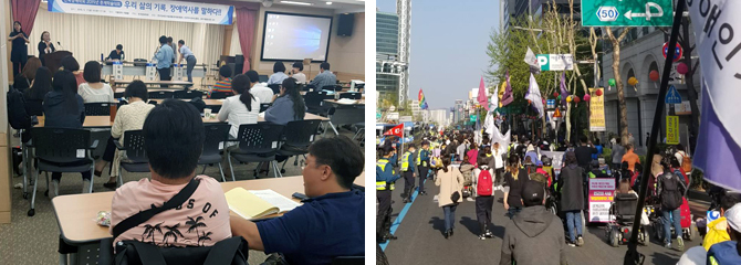 数ある当事者の活動に共通して感じることですが、「障がいを持っていても、人として社会の中で生きる権利がある」と社会を変えようとする熱気は非常に強いもので、 街中で大きく声を上げながら練り歩く大行進や集会など、数百人規模で行われる迫力ある物は韓国ならではと言っても過言ではないでしょう。