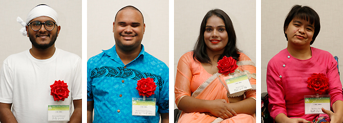 はじめに財団代表の山村理事長と公益財団法人日本障害者リハビリテーション協会の福母常務理事から激励言葉がかけられました。その後、一人一人に認定証が手渡され、ベトナム・ネパール・サモア・モルティブの4名の研修生が覚えたての日本語・日本手話であいさつをしました。