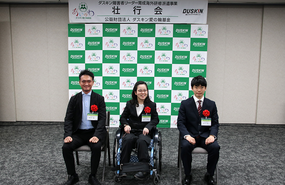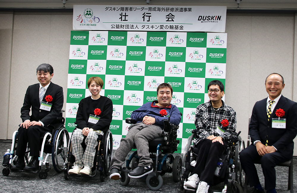 ダスキン障害者リーダー育成海外研修派遣事業 第40期・42期生壮行会を3月17日にダスキン本社で開催しました。コロナ禍でもあり、研修派遣生のご家族やサポーター等の参加者を限定して、オンライン視聴とのハイブリッド開催で実施、壮行会では、ダスキン愛の輪基金山村輝治理事長より、激励の言葉、ミスタードーナツフランチャイズ共同体小川美樹理事長より、研修生へプレゼントが贈られました。