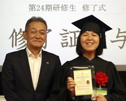 研修生4名は、来場した支援者の皆様に、自分達を「4つの喜びのタネ」に例えて、多くの人たちのお陰で充実した時間が送れたことを報告。財団理事長より母国でのリーダーとしての活躍を祈念して一人ひとりに修了証が手渡されました。来場された方々からキャップとガウンに身を包んだ彼女たちへ惜しみないエールの拍手が送られました。